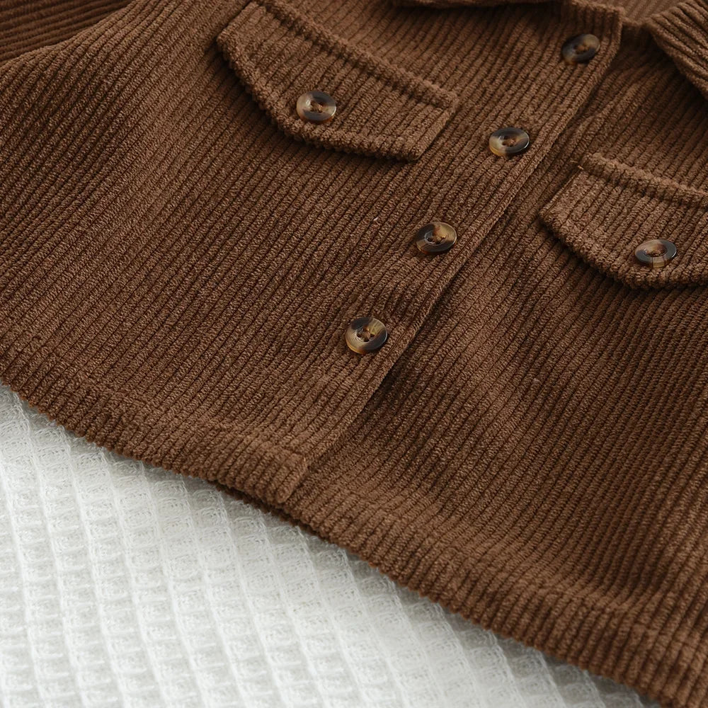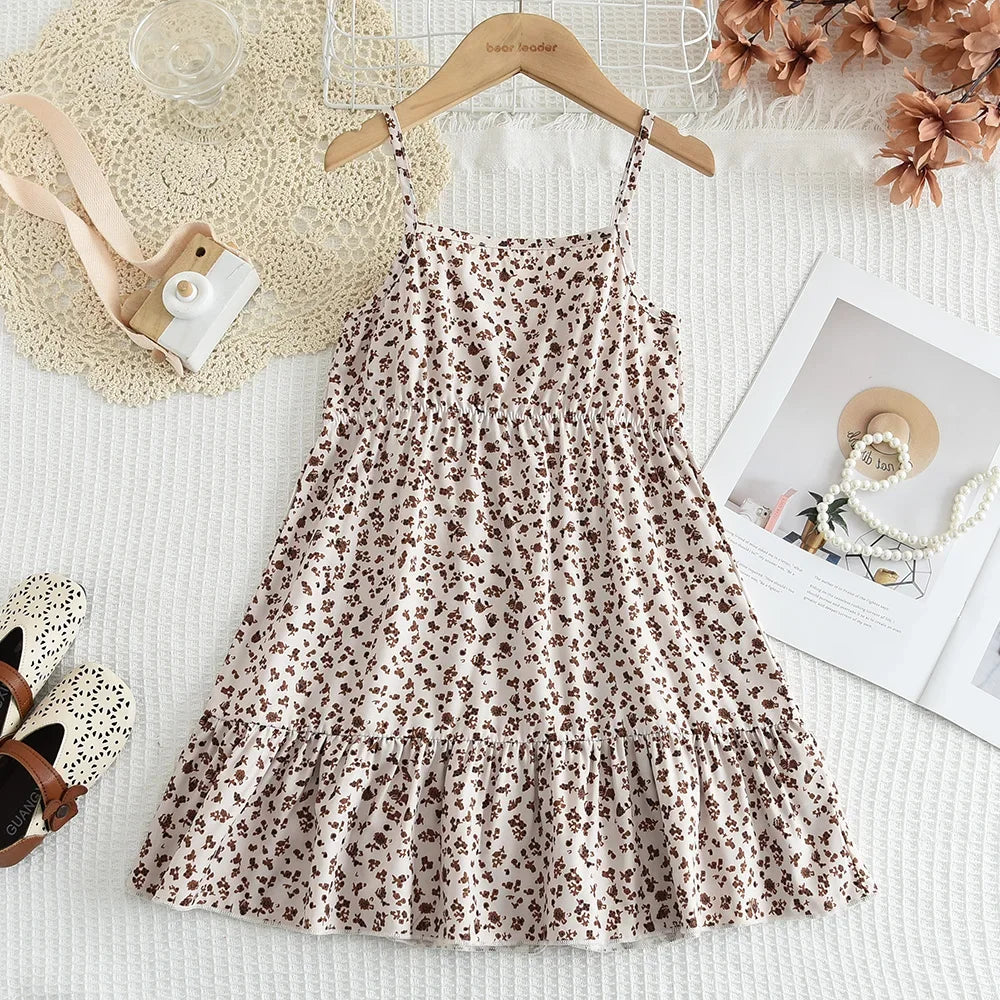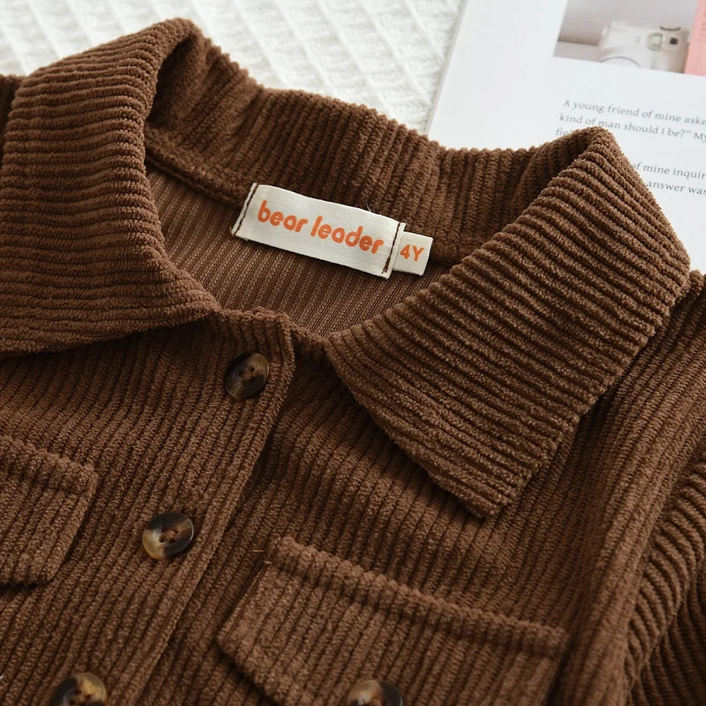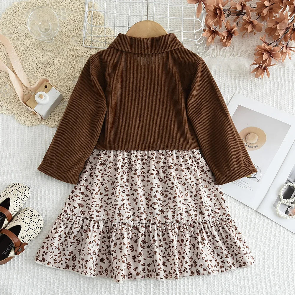 Autumn Girls Coffee Color Outfit – Long Sleeve Lapel Jacket & Floral Camisole Dress 2-Piece Set